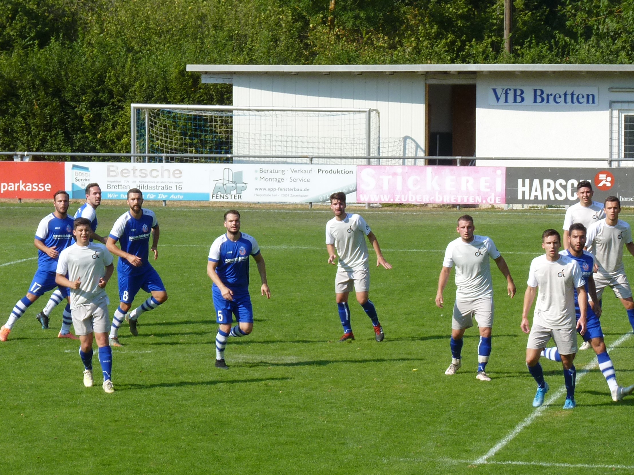 Der VfB Bretten , weiße Trikots, stemmte sich bei Eckbällen den gefährlichen Gästen entgegen