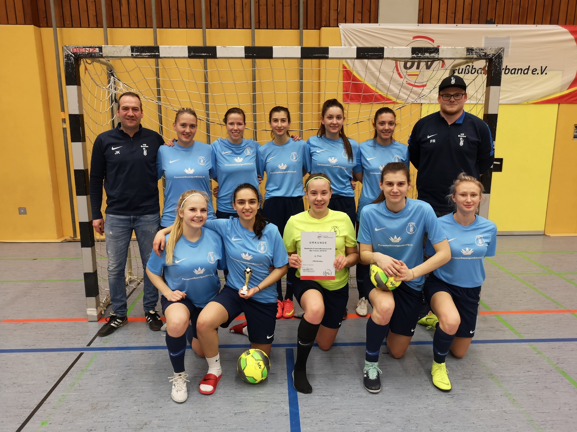 (kri) Der weibliche VfB Tross reiste mit ihren Trainern Fabian Reindl und Jochen Keller zu den Badischen Futsal Meisterschaften nach Mosbach. In der Gruppe B hatte man es mit den Teams aus Viernheim, Waghäusel und St. Leon/Mingolsheim zu tun. In der Gruppe A war der KSC das bestimmende Team. Im entscheidenden Spiel um den Einzug ins Halbfinale setzten sich die Brettnerinnen gegen den Oberligisten aus Waghäusel mit 1:0 durch. Danach traf man im Halbfinale auf die starken KSC Mädchen und musste die Segel streichen. Nun war noch der Schritt aufs „Stockerl“ möglich, doch man unterlag dem TSV Neckarau im Sechsmeterschießen. Den Titel des Badischen Meisters holte sich der KSC vor Viernheim. Große Freude dann bei allen VfB Mädels, denn bei der Stimmabgabe aller Teams wurde Melisa Perihan Eraymaz zur besten Spielerin gewählt und erhielt unter dem Beifall der ganzen Halle einen Preis.