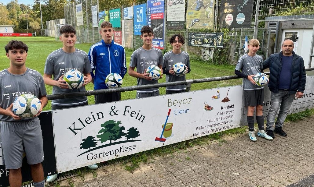 Orhan Beyaz von Klein und Fein Gartenpflege und Cleanservice überreichte Trainer Alexander Dittes Trainingsbälle für die B2.