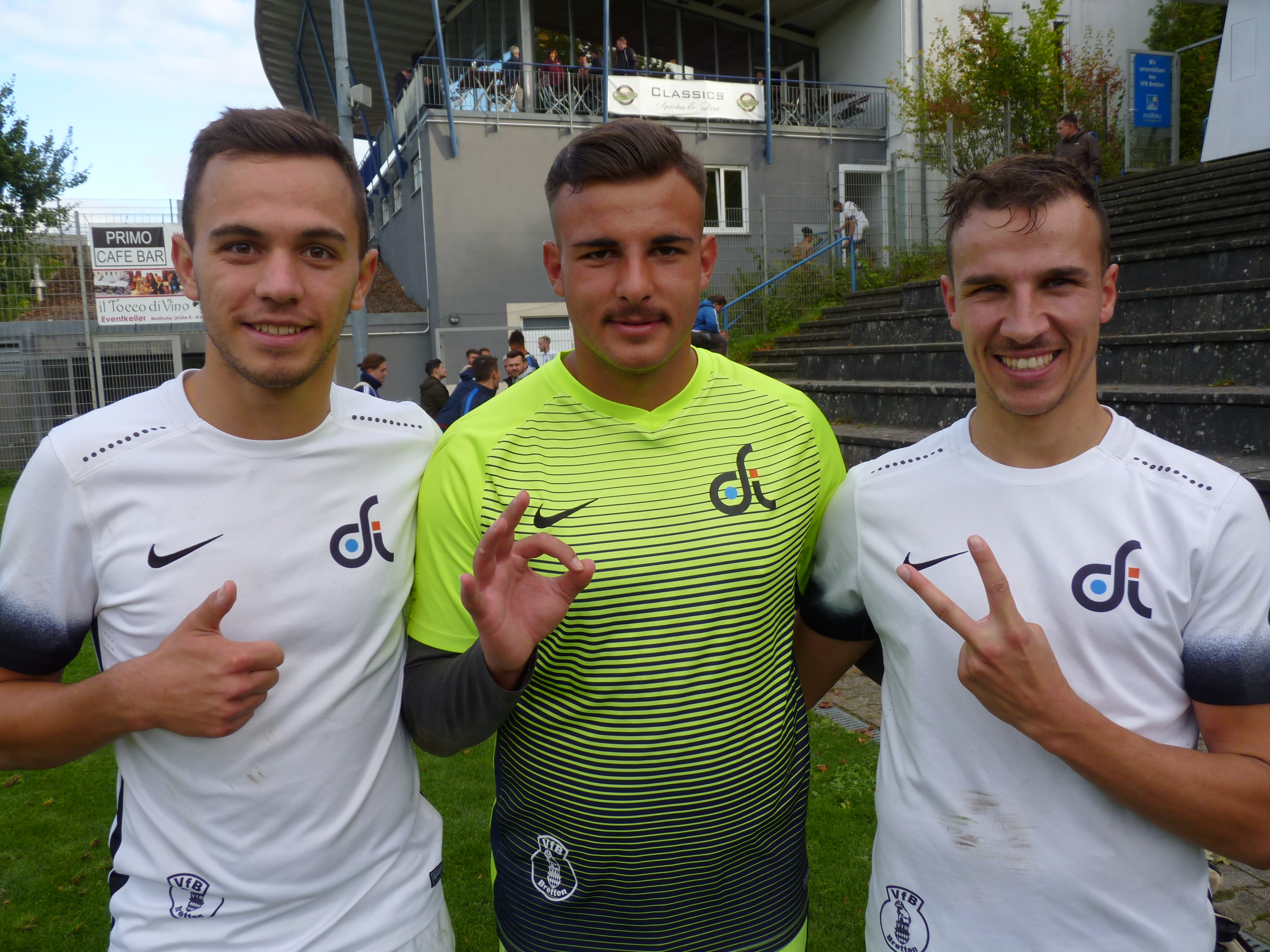 Die Torschützen Silas Wittig (1) li.) und Nikolai Albrecht (2) re.) rahmen den jungen Torwart Dominik Georgiev ein, der für das zu null verantwortlich war.