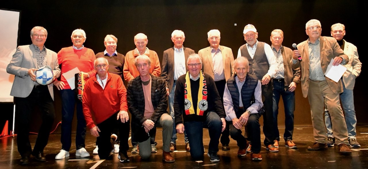 Nun trafen sich die ehemaligen Spieler mit Frauen zum „Fünfzigjährigen“ bei der VfB Jahresfeier. Ehrenspielführer Herbert „Herle“ Kritter stellte die Abwehr mit Klaus Hoffmann, Kurt Jung, Richard Reil, Alfred Rothbauer und seiner Wenigkeit vor. Es folgte das Mittelfeld mit Reinhold Brücker, Hubert Huck und Horst Kinder. Die Tore schossen Hartmut Bechtold, Hartmut Glaser, Hermann Leis, Hermann Renner und Roland Wieland. Betreuer war Josef Reindl. Einige Akteure konnten nicht kommen, aber die, die da waren, schmetterten noch auf der Bühne im Playback das Fußballlied „Fußball ist unser Leben, denn König Fußball regiert die Welt“. Es wurden viele Erinnerungen ausgetauscht und bei „DJ DANTY“ zeigten die Oldies, dass die Kondition auch noch für ein Tänzchen reicht.