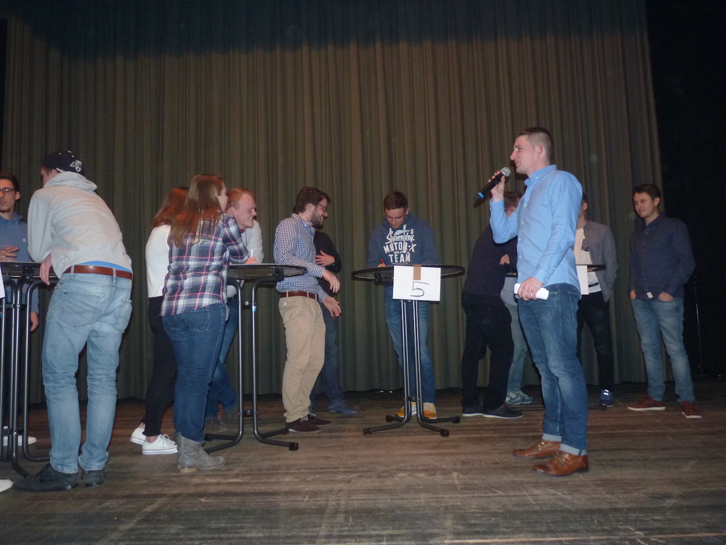 Dann führte Franco De Vita in seinem traditionellen kanariengelben Jackett durch das Programm. Als erster Punkt stand eine grandiose Jonglage Show von „Ridiculus Artifex“ an, bei der Patric O. und Lars I. Keulen, Bälle und Messer durch die Luft wirbeln ließen. Herausragend noch die Diabolo Show und alles noch begleitet von Humor und Zaubertricks. Begeisterter Applaus war der Lohn für die tolle Aufführung. Tobias Hammes bat dann die Trainer der A Junioren, I. und II. Mannschaft und des Damenteams mit je zwei Aktiven zu einem sportlichen Wettstreit „Mein Spieler kann“ . Danach stand die Folge „ Knapp daneben ist auch vorbei“ mit humorvollen Fragen auf dem Programm. Ein Bilder Rückblick von Dominic Prüfer über die Verbandsrunde, die Skiausfahrt und den Campingaufenthalt bei Freiburg rundeten das Programm ab.
