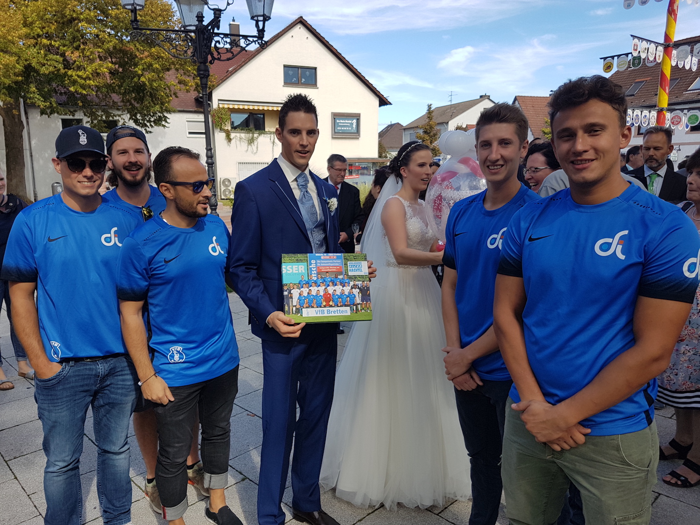 Unser Fitness-Trainer Sebastian Kunz hat am Samstag den 8.9.2018 in der evangelischen Kirche in Eggenstein seine Anja geheiratet. Vom VfB waren Spieler und Fabienne Hachtel und Wolfgang Hermann als Offizielle vor der Kirche im Trikot Spalier gestanden und haben Anja und Basti im Namen aller VfB’ler ganz herzlich gratuliert. Florian Hammes überreichte dem Brautpaar hierbei ein Mannschaftsbild, Blumen und einen Gutschein für das VfB Clubhaus. Der VfB wünscht den Beiden für Ihre gemeinsame Zukunft alles Gute, viel Glück und eine wundervolle Zukunft zu zweit.