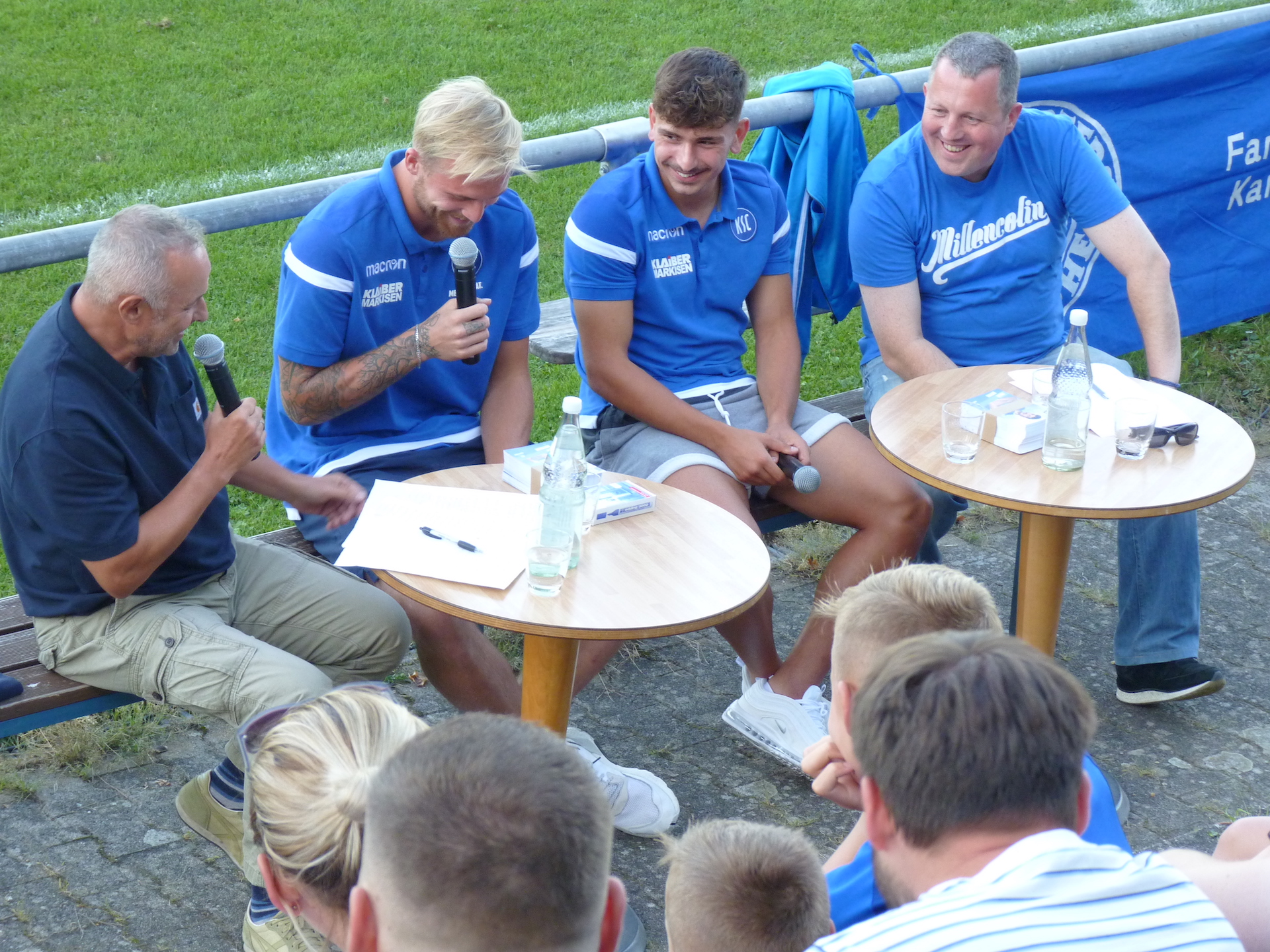 (kri)  Beim Fan Projekt „Nachspielzeit“ besuchen die KSC Fans Clubs aus dem Anhängerkreis der Blau-Weißen und laden dazu auch Profis ein. Eine ansehnliche Menge an KSC Fans hatte sich auf der Zuschauertribüne im VfB Stadion versammelt und lauschte interessiert den Ausführungen der beiden Profis, die von den Interviewern MaD und Hansi mit Fragen „gelöchert“ wurden. Darunter bei Philipp Hofmann auch unangenehmen Inhalts, die aber der Profi eloquent beantwortete. Bei Malik Batmaz, der ja ein gebürtiger Brettener ist und schon in der Jugend des VfB gekickt hat, waren die Rede und Antwortspiele angenehmer und die Zuschauer geizten nicht mit Beifall und Lachen. Fragen aus dem Publikum wurden wenige gestellt und danach gaben die Profis Autogramme und Eintrittskarten zum KSC Spiel gegen Sandhausen wurden verteilt.