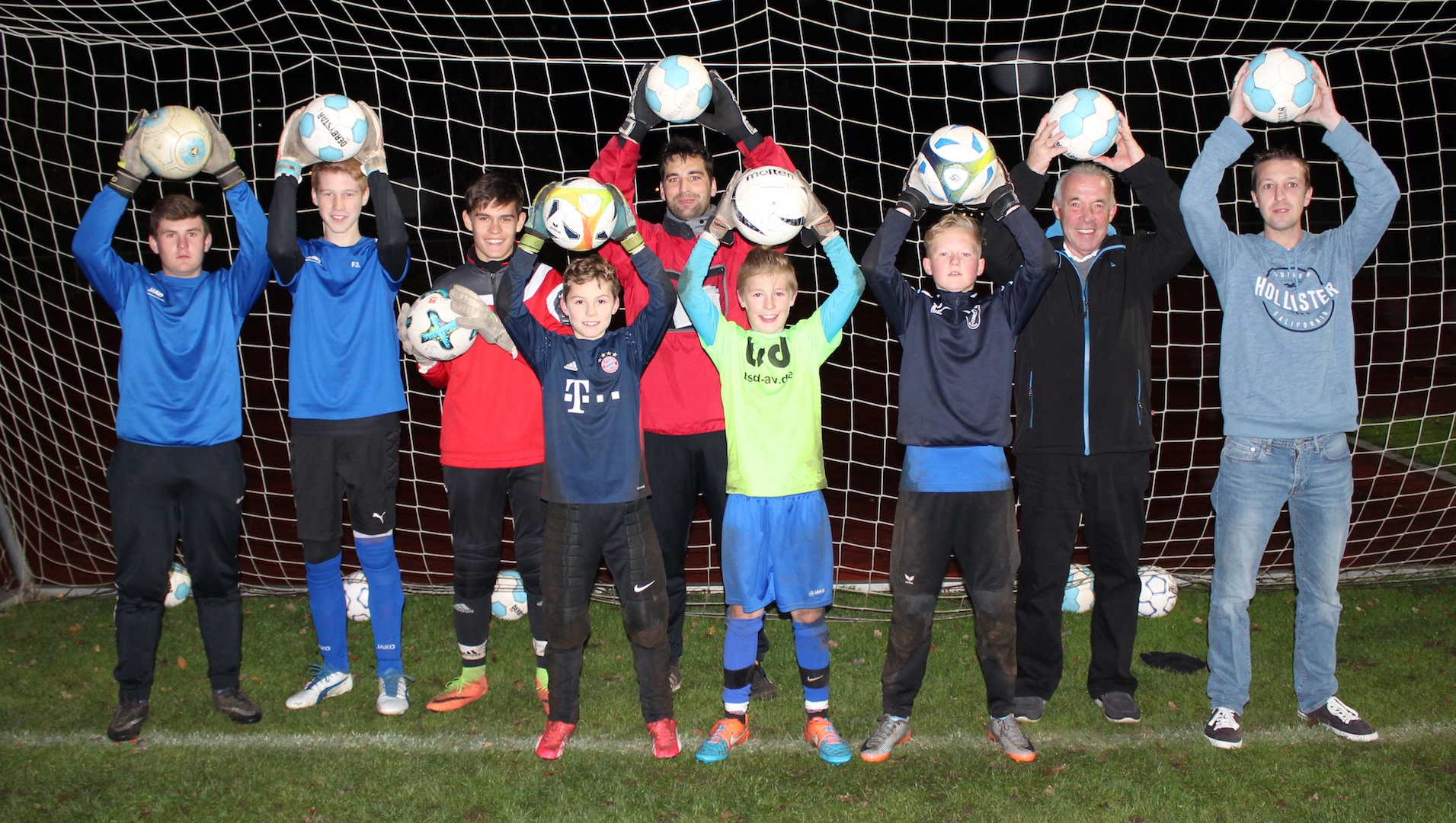 Die Jugendtorhüter mit Manuel Görzner (im Hintergrund) und den beiden Geschäftsführern Günther und Michael Schneider von Schneider Bahntechnik GmbH (ganz rechts).