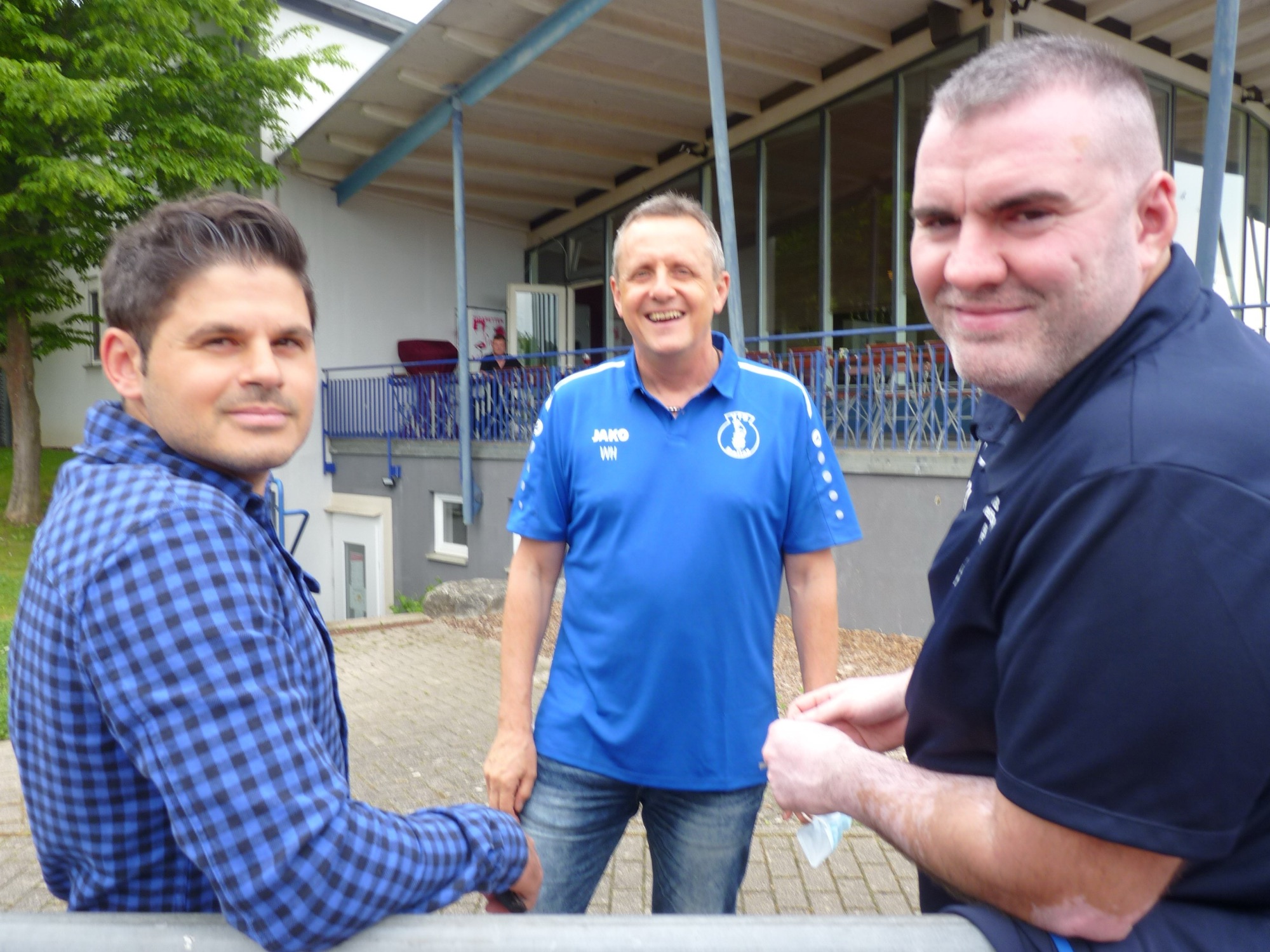 Trainer Tiago Alves im Gespräch mit dem sportlichen Leiter Wolfgang Hermann (Mi) und dem zweiten Vorstand Daniel Dawood (li), der auch noch in der dritten Mannschaft spielt.