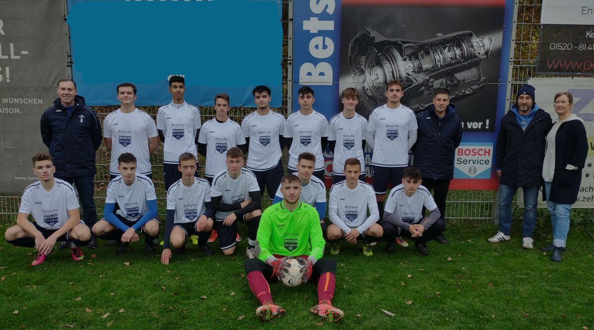 Stolz präsentiert die A-Jugend ihre neuen Trikots. Mannschaft und die Trainer Achim Barth, Heiko Pelzer, Tommy Midzic u. Thomas Vögele bedanken sich sehr herzlich bei Michael Betsche und seiner Frau Heike.
