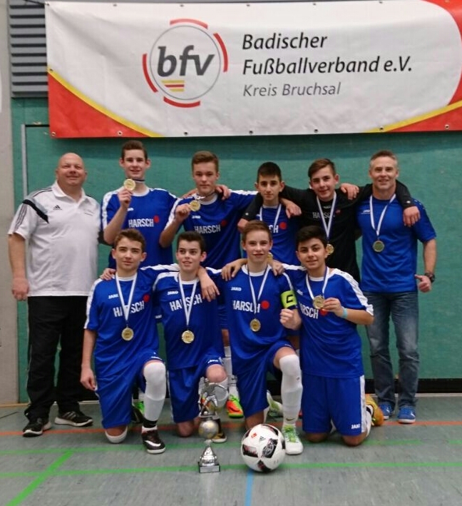 (kri) Eigentlich sind sie keine „Hallenfüchse“, die C 1 Jungs von Trainer Michael Wenzel, denn sie trainieren mangels Hallenkapazität auch im Winter im Freien und hier auf dem neuen Kunstrasenplatz. Trotzdem beteiligten sie sich an den Hallenkreismeisterschaften des Fußballkreises Bruchsal, die nach Futsal Regeln ausgetragen wurden. Zum ersten Vorrundenturnier nach Oberhausen fuhr man deshalb ohne große Titelambitionen, aber als man dann mit vier Siegen weiterkam, wuchs die Freude am Hallenfußball. In der Zwischenrunde in der Rheintalhalle in Kirrlach erwischten die Jungs eine Hammergruppe mit vier Landesligisten und konnten sich mit zwei Siegen, zwei Unentschieden und einer Niederlage für die Endrunde in der Wagbachhalle in Wiesental qualifizieren.