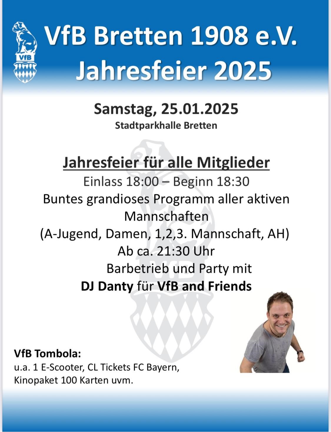 Am Samstag, 25.01.25 findet unsere grandiose Jahresfeier statt. Ab 18:30 wird ein vielseitiges Programm der aktiven Herrenmannschaften, Damenmannschaft, Alte Herren und A-Jugend geboten sein. Tragt euch den Termin im Kalender ein.